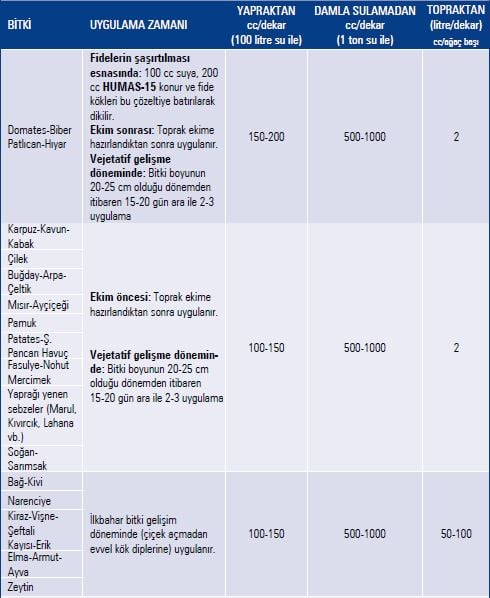NOT: Yapraktan uygulama dozları 10-15 gün ara ile, damla sulama dozları ise haftalık olarak uygulanır.